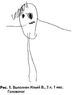 Отже, коротко про основне. Предметний малюнок з’являється у дітей приблизно в трирічному віці. Перша форма зображення людини – це так званий головоног, що представляє собою округлу голову (на думку деяких фахівців, ця окружність символізує голову разом з тілом) і руки та ноги, які відходять від неї або розташовані поруч рисочки (кількість яких може бути різним). Нерідко на малюнках присутні також риси обличчя (очі, рот, ніс), іноді і волосся. Подібний малюнок цілком відповідає нормі аж до чотирирічного віку.