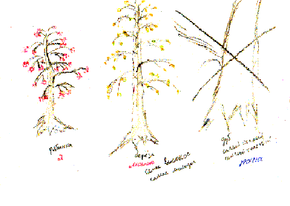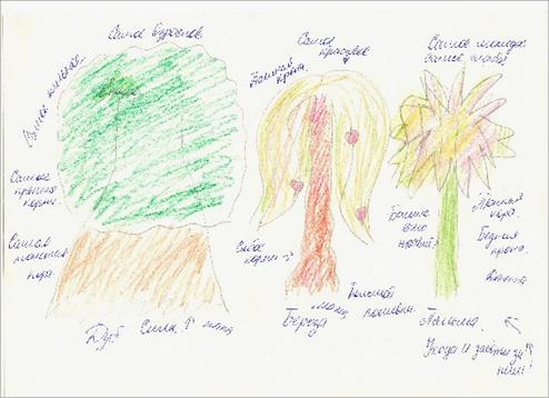 Зустрічаються випадки, коли дитина всупереч інструкції малює тільки два дерева, що говорить про порушення взаємодії в сім’ї з третім об’єктом – батьком, або навіть про повну відсутність тріангуляторних відносин.