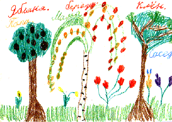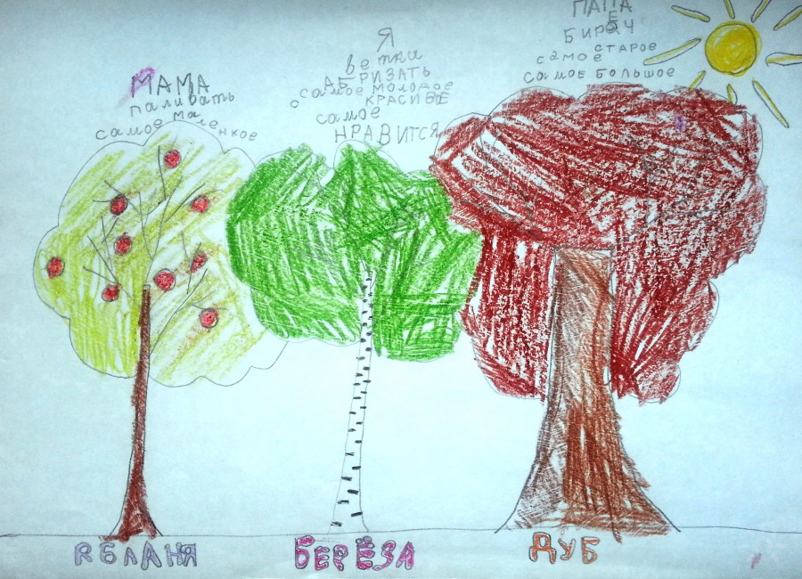 Порівнюючи дерева з членами сім’ї, діти зазвичай вибирають себе і батьків. Але іноді це може бути брат, сестра, бабуся, дідусь або будь-яка інша людина, наприклад, сусід. У цьому випадку в подальшій бесіді важливо розпитати дитину, чому вона вибрала саме цих “членів сім’ї”, а інших витіснила.