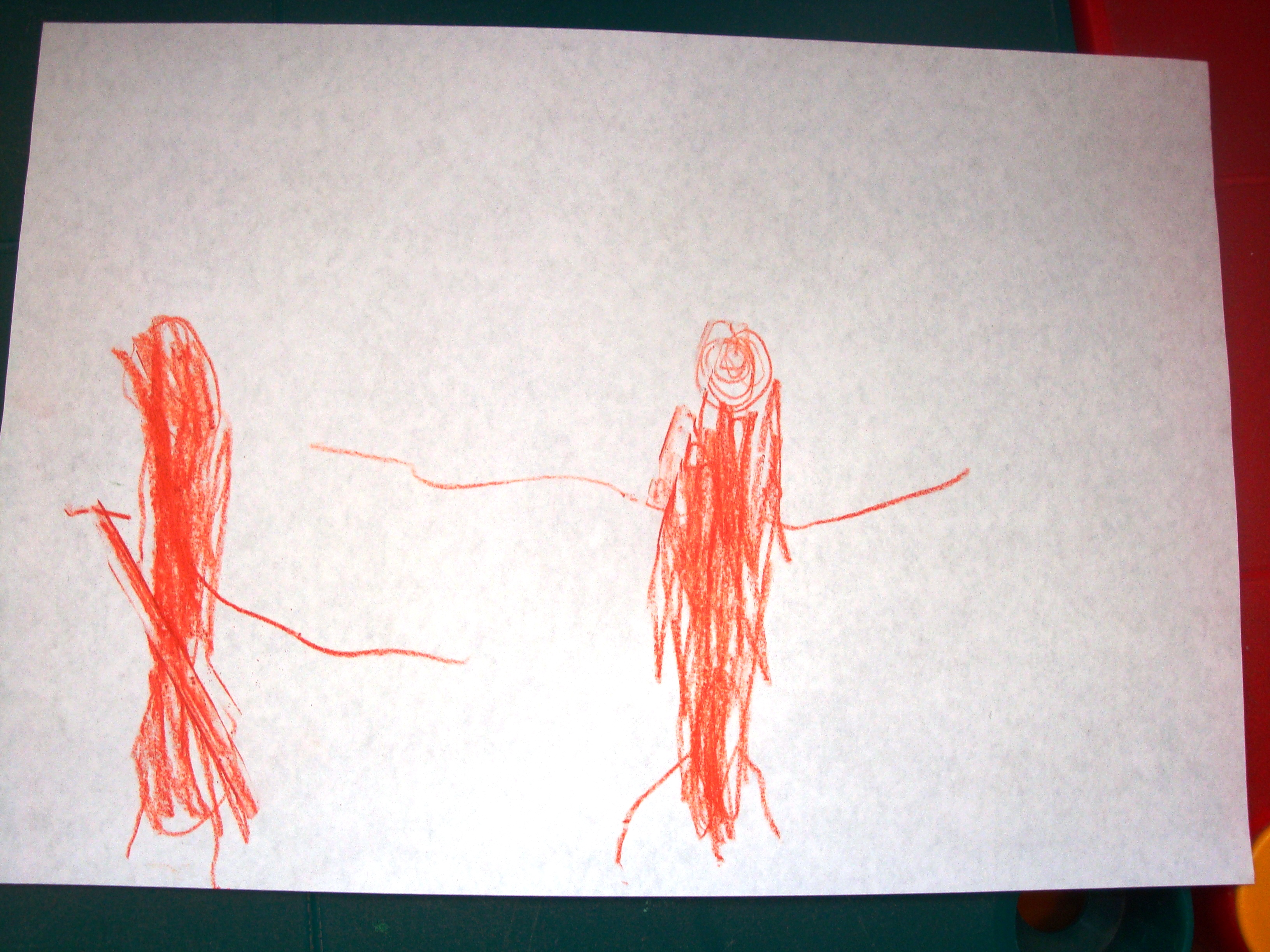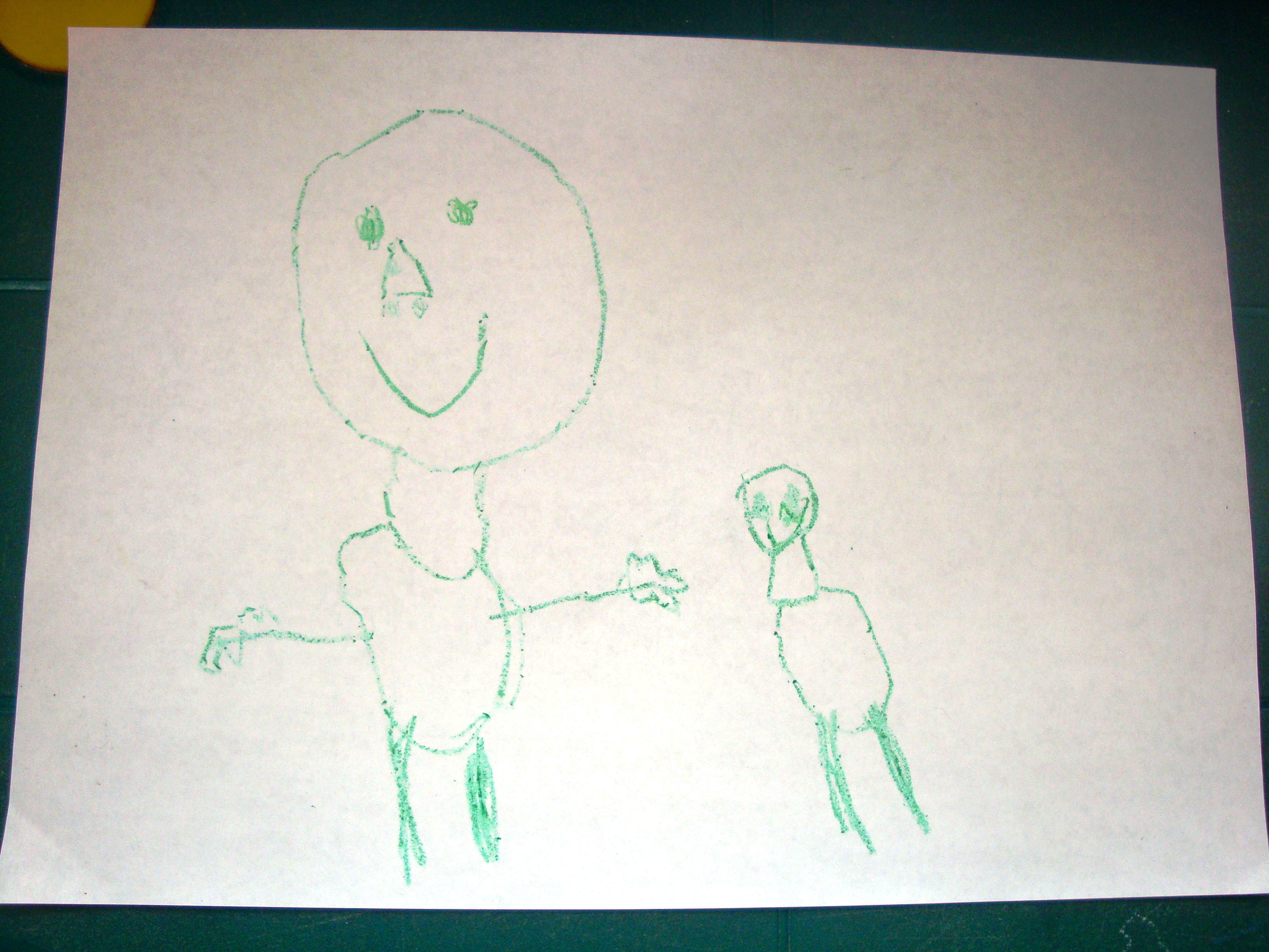 На малюнку №2 хлопчик (5 років) намалював маму і себе. В очі кидається великий розмір голови мами (свідчить про те, що досліджуваний велике значення надає саме мисленню, раціональній сфері), екстравертована поза (свідчить про відкритість) та відсутність рук на малюнку у хлопчика. На останньому зупинюсь детальніше. Руки – це символ комунікативності і активності. Думаю, що саме на активність треба звернути увагу в даному випадку, оскільки по ходу виконання малюнку хлопець неодноразово говорив про те, що він “не вміє”, “не може”, “не знає як” малювати, про те, що втомився і хоче відпочити; крім того постійно перепитував чи правильно він малює (кожен штрих!). Батьки дитини відмічали, що хлопець часто демонструє невпевненість у власних силах. Думаю, що саме це міг показати хлопчик на своєму малюнку.