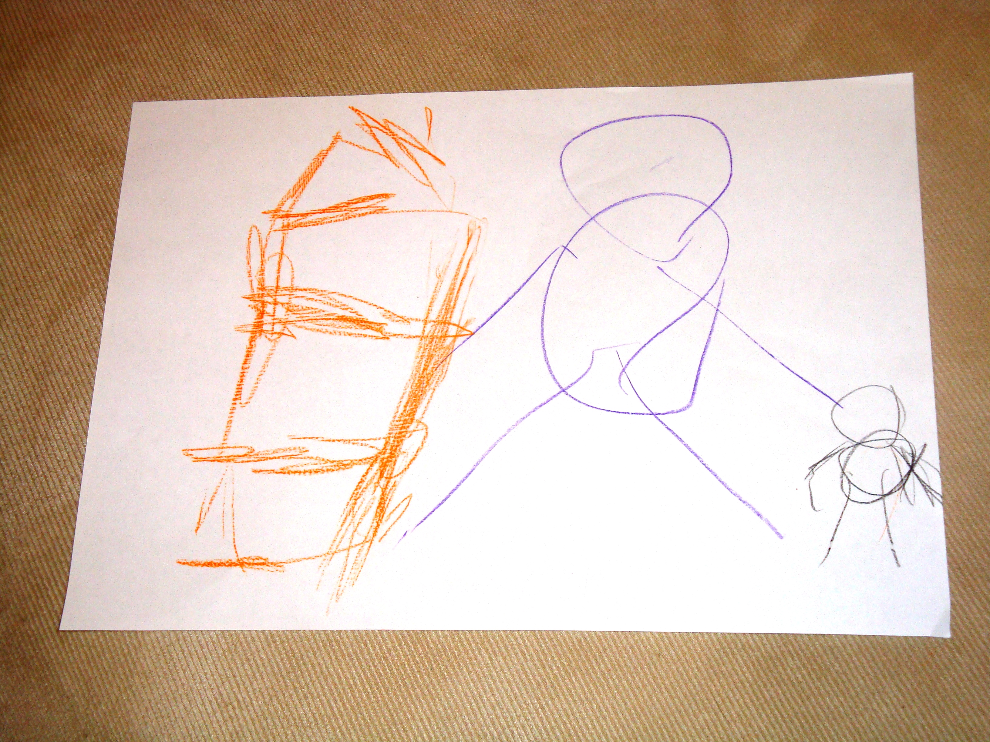 На першому малюнку хлопчик (5 років) намалював будинок, маму і себе. Саме зображення будинку (хоча цього і не було в інструкції) свідчить про теплоту та затишок, але лінії, якими окреслений будинок демонструють сильний натиск, що може свідчити про деяку тривожність. Насторожує відсутність рис обличчя. Взагалі, обличчя – символ сфери спілкування, найважливіший центр комунікації. Дитина, яка зазнає труднощів у спілкуванні, упускає зображення рис обличчя. Те, що мені відомо із сімейної ситуації (мама була в мене на консультації): батьки дуже люблячі; мама досить сильно переймається розвитком дитини, прагне, щоб він виконував різні завдання, вмів читати, а дитина демонструє надзвичайно великий протест цьому. Можна припустити, що відмова від спілкування, взаємодії, яку показав хлопчик на малюнку – результат надмірного тиску батьків. Цікаво, що малюк намалював екстравертовані пози, що свідчить про готовність до взаємодії, відкритість. Це ще раз підтверджує, що дитина відкрита, але на даному етапі демонструє протест.