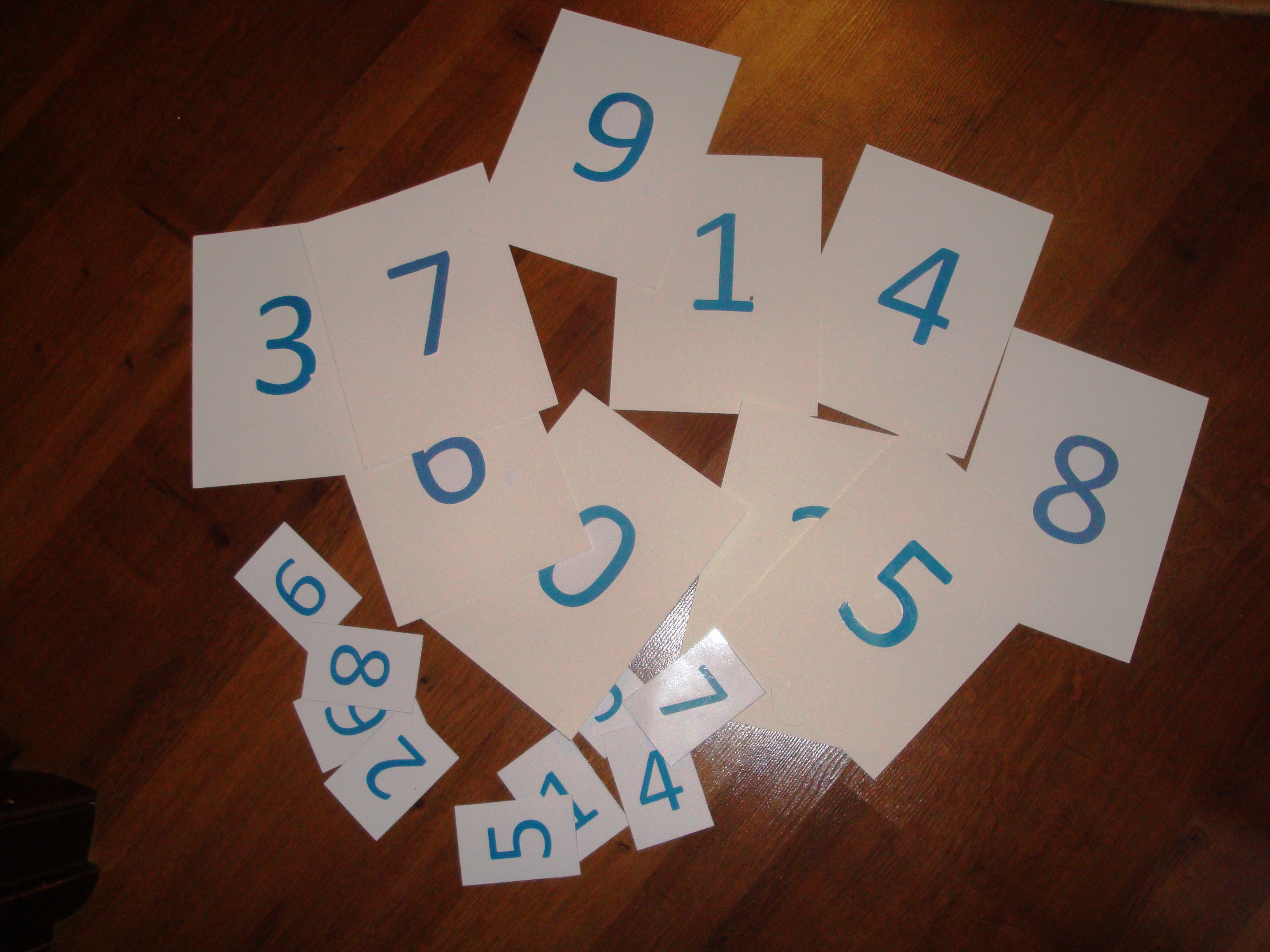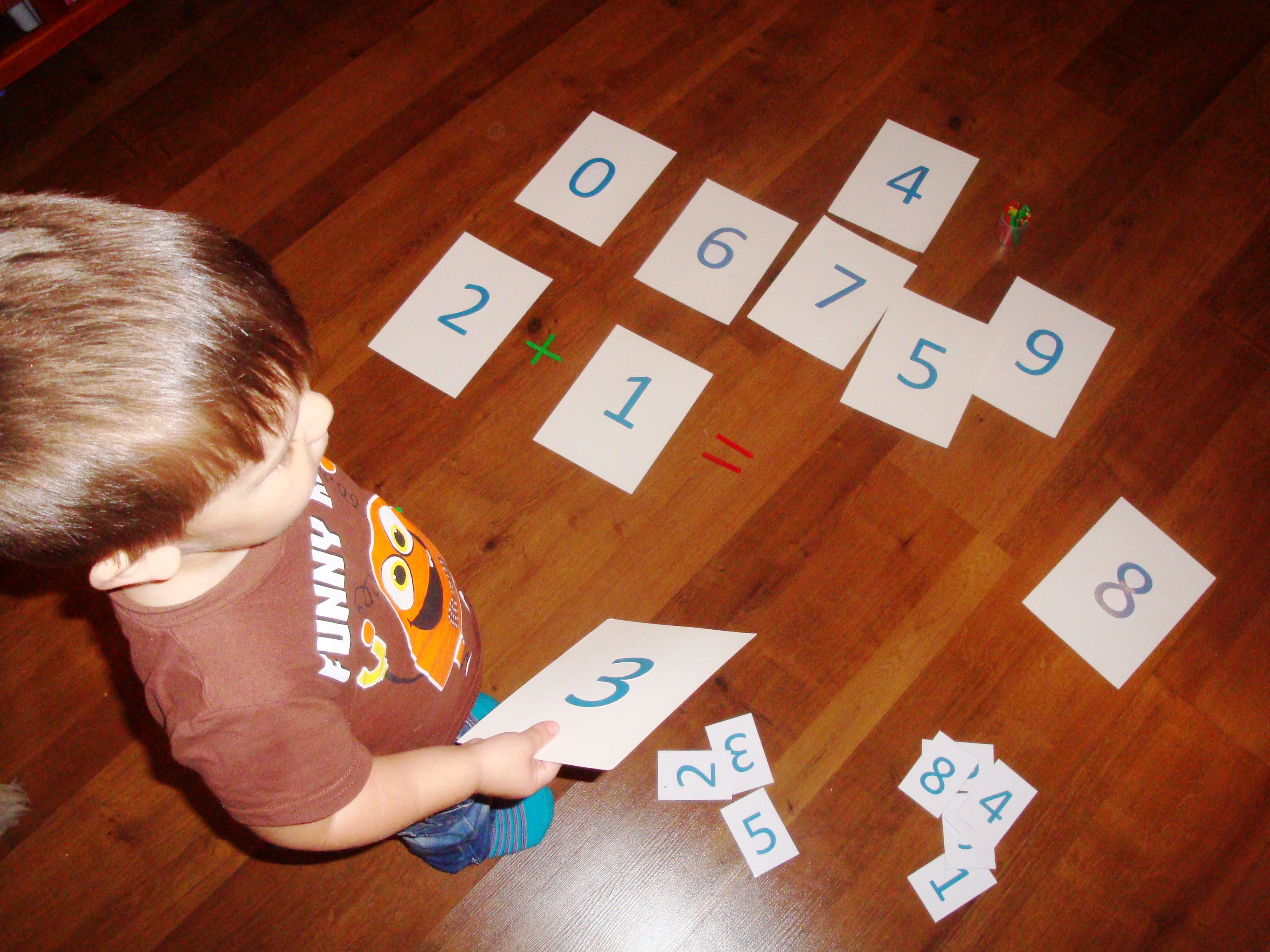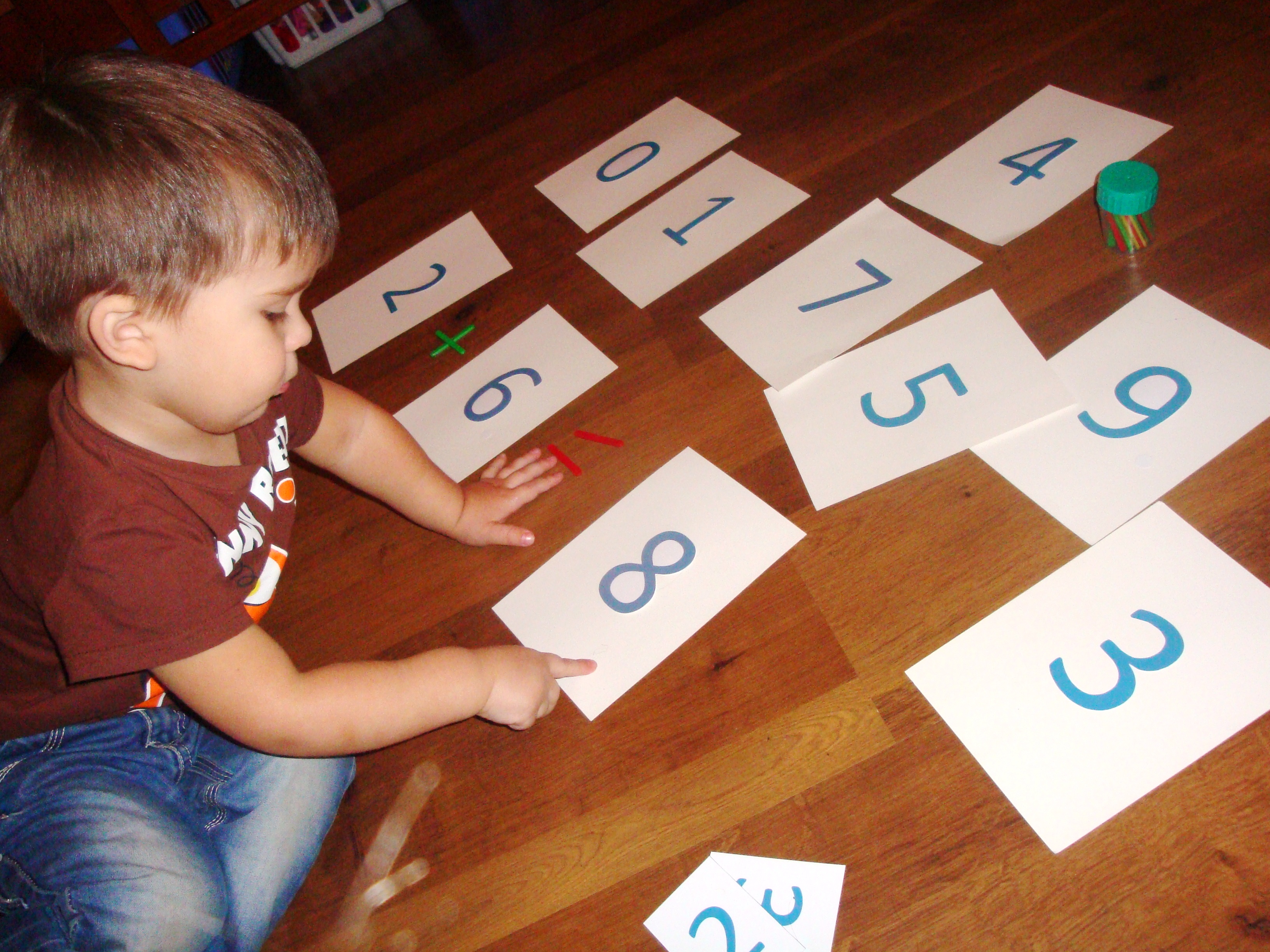 Перша гра. Завдання полягає в тому, щоб розкласти маленькі цифри на великі, не називаючи. Дитина шляхом порівняння і співвіднесення малюнків знаходила правильний варіант. Потім завдання ускладнювалось – я видавала сину маленькі цифри, а він, назвавши правильно, клав їх на великі.