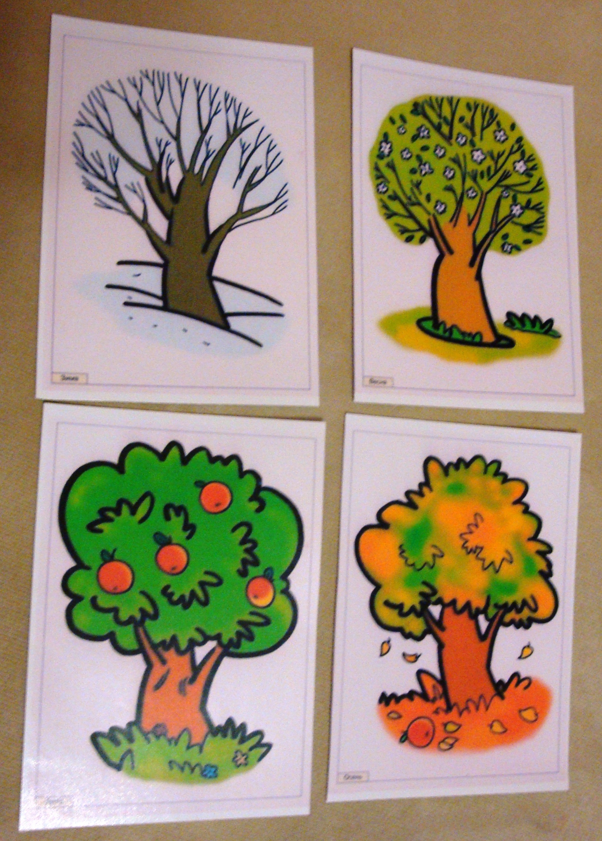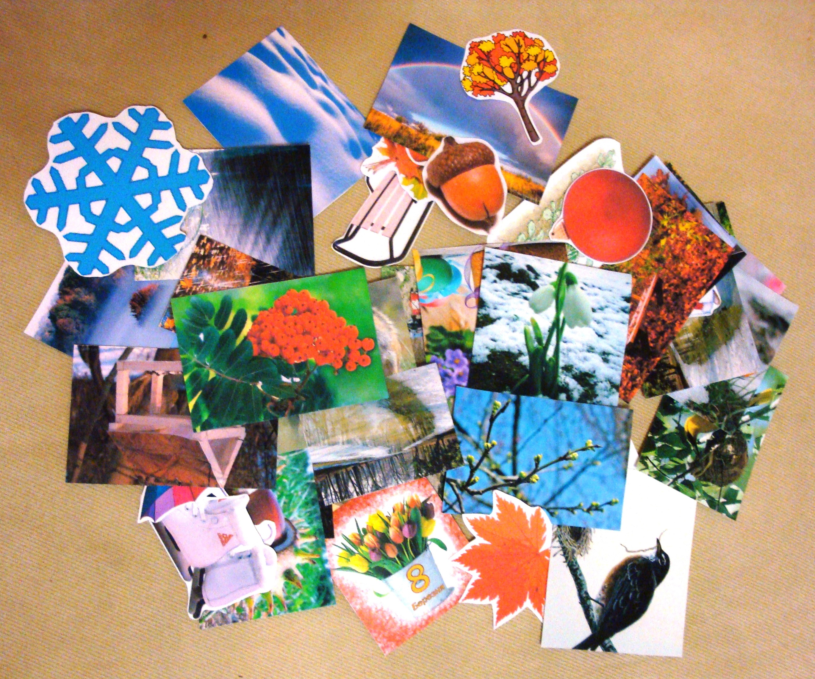 2. Дидактична гра «Що буває весною?». На столі лежать упереміш картинки із зображенням різних сезонних явищ (йде сніг, квітучий луг, осінній ліс, люди в плащах і з парасольками і т.д.). Діти по черзі вибирають картинки, де зображені тільки весняні явища і називають їх. Кожен вибір малюка необхідно проговорити, з’ясувати чому він правий чи ні. Малюнки можете скачати тут.