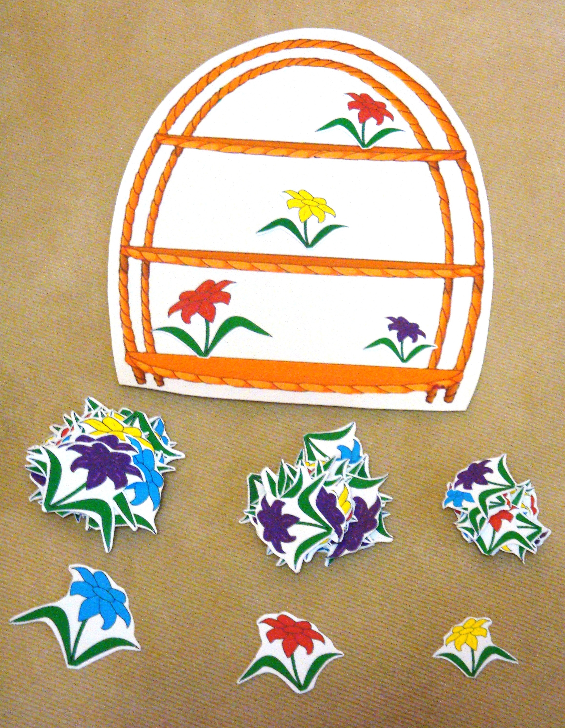 4. Гра «Квіти на поличці». Спочатку розкладаю карточки із зображенням квітів, за допомогою яких ми обговорюємо з дітками найперші весняні квіти. Потім граємо у гру. Матеріал: кожній дитині роздати аркуш паперу (в мене він заламінований) з зображенням поличок, а на середину кола покласти різноманітні квіти. Я надаю завдання дітям: «Візьміть середню червону квіточку та покладіть на верхню поличку справа» і т. д. Ця вправа спрямована на розвиток орієнтації в просторі та засвоєння понять: право, ліво, вгорі, внизу, великий, маленький, середній…). Шаблони можете скачати тут.