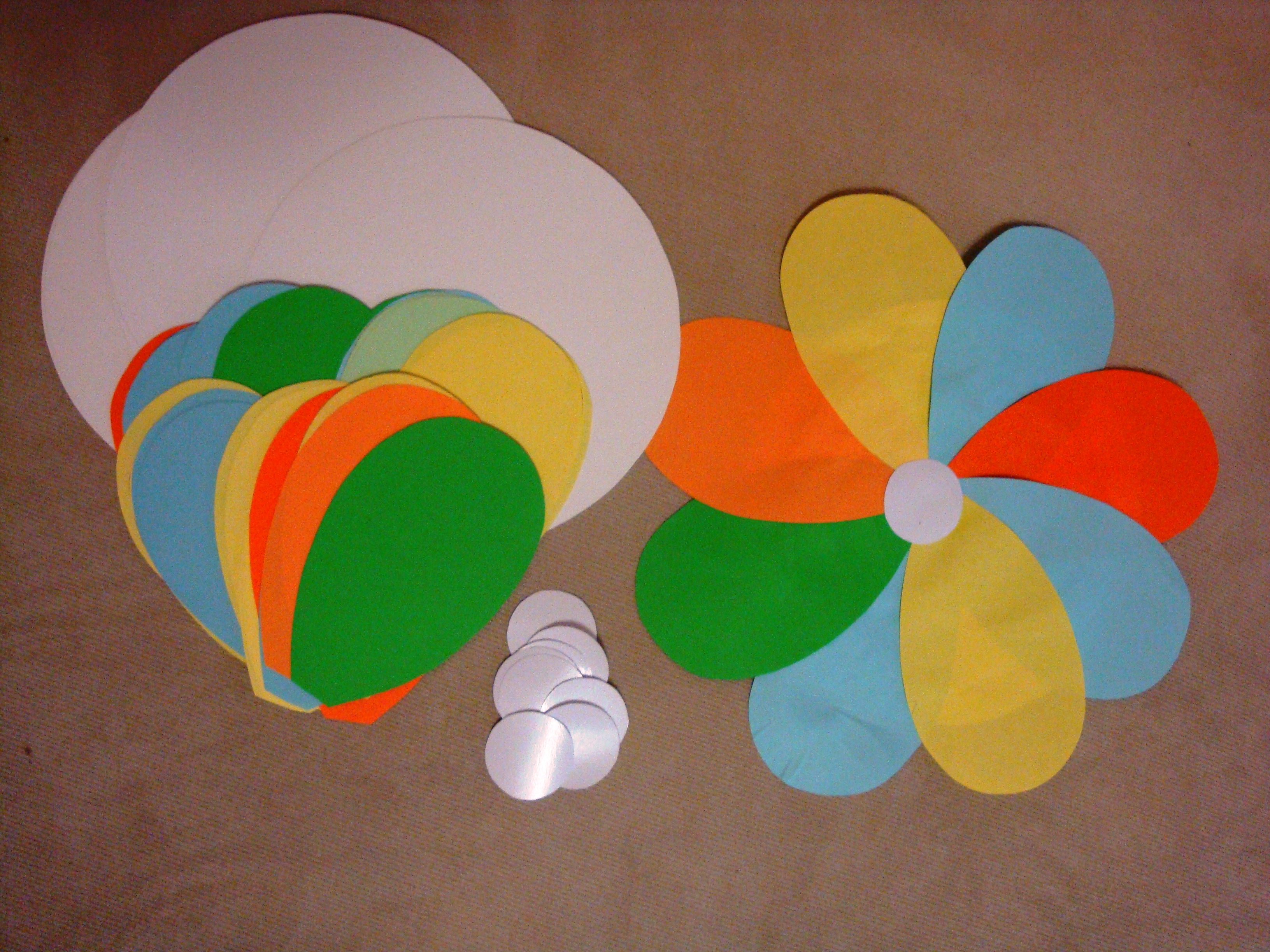 7. Аплікація «Квітка». На цей раз аплікація у нас не звичайна, а несе дуже глибокий зміст. Матеріали: кольоровий папір (можна картон); клей ПВА, білий цупкий папір формату А4. Перед заняттям я зробила невеликі заготовки – вирізала пелюстки, серединку, основу для квіток з різнокольорового паперу. Завдання для дітей полягає в тому, щоб «зібрати» та приклеїти квітку. Приблизно так вона повинна виглядати.