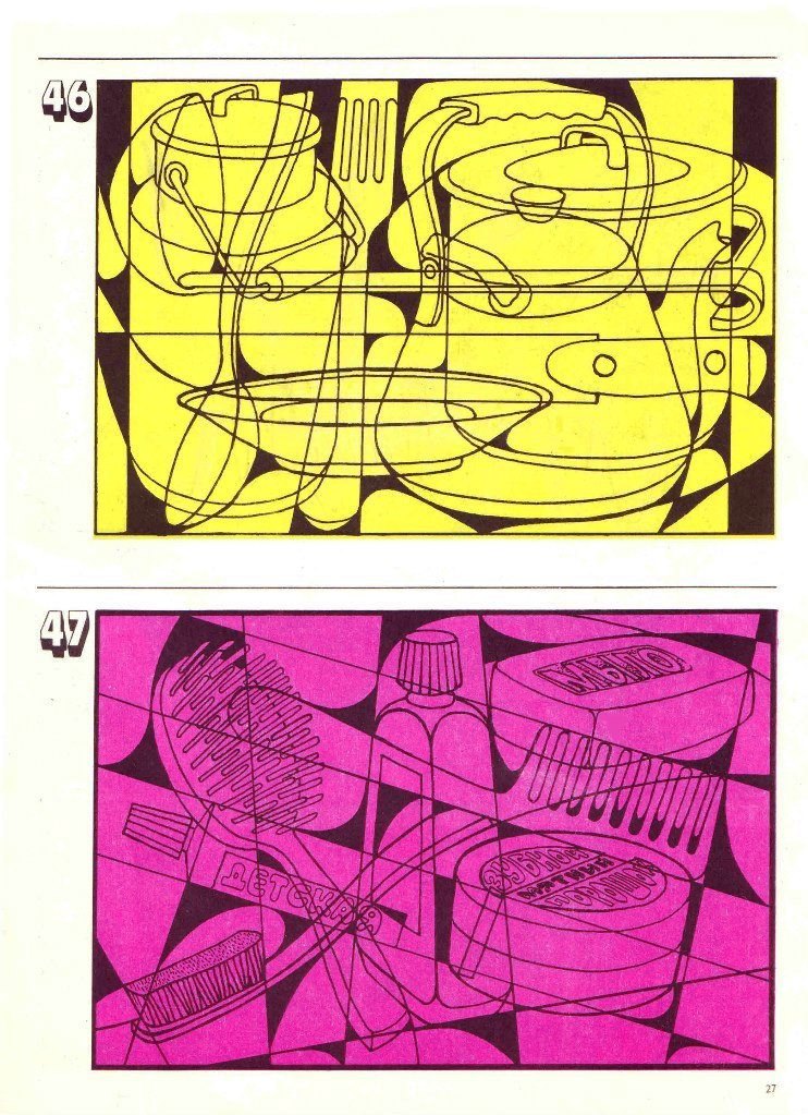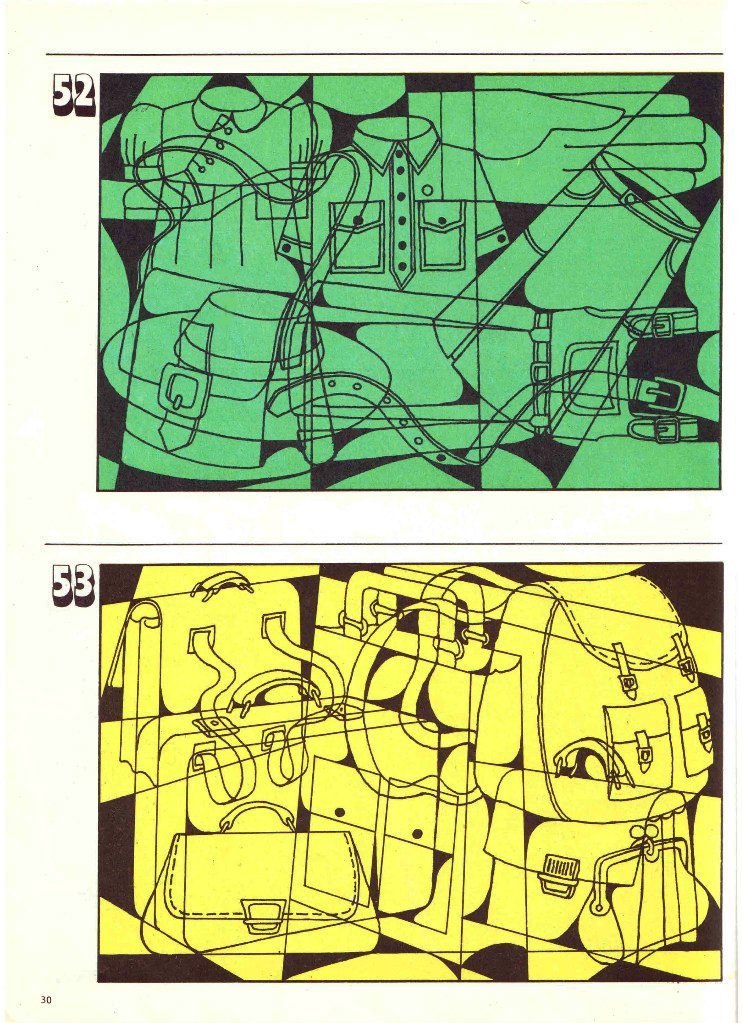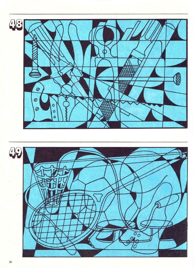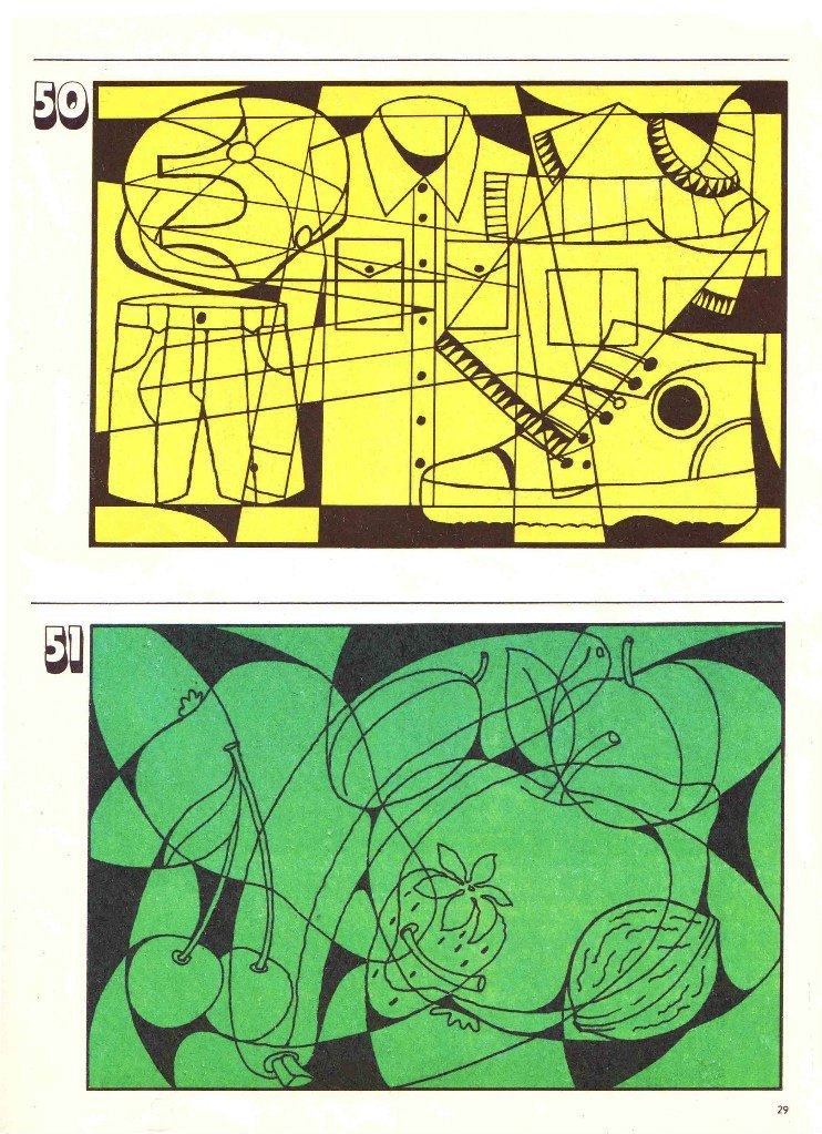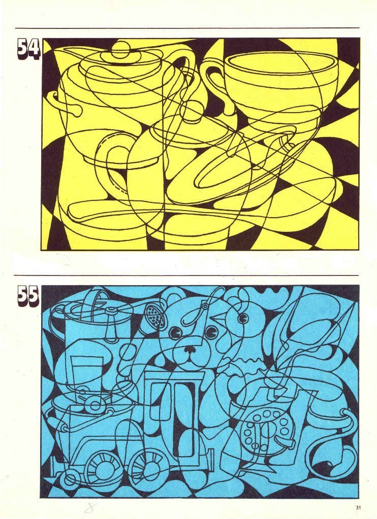 Завдання із альбому Гільбуха Ю.З. для розвитку цілісності сприйняття, концентрації та стійкості уваги. За допомогою цих картинок можна побачити те, як дитина виділяє ціле, як подає інформацію, а також рівень пошукової активності, вміння почути і виконати інструкцію. Наприклад, дитина може брати картинку в руки і повертати його, шукаючи певний ракурс, який дозволить знайти нові предмети.