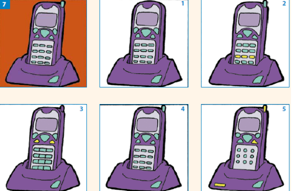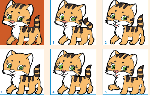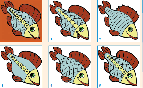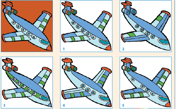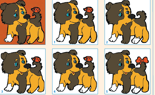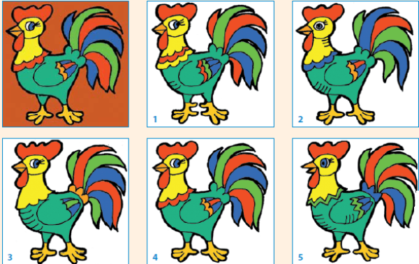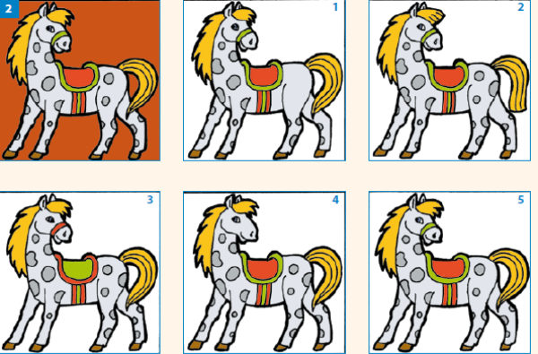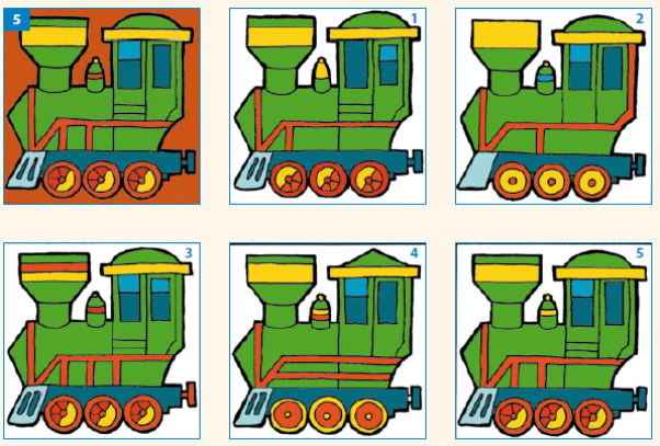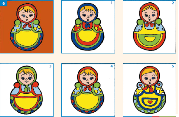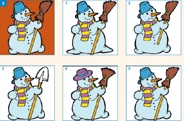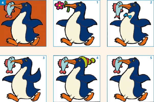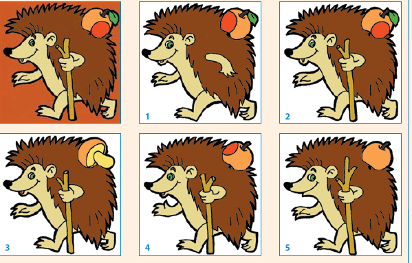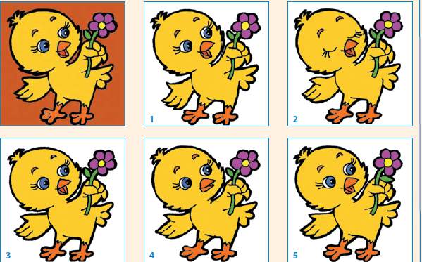 Завдання із альбому Гільбуха Ю.З. для розвитку спостережливості, стійкості, концентрації уваги. Дитині пропонується знайти малюнок-двійник тому, що знаходиться в лівому верхньому кутку. Зображення всі досить подібні між собою, що вимагає від дитини зосередженості, поміркованості, здатності утримувати кілька ознак.