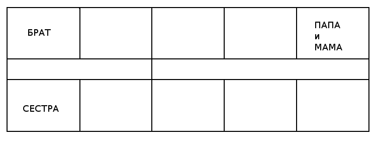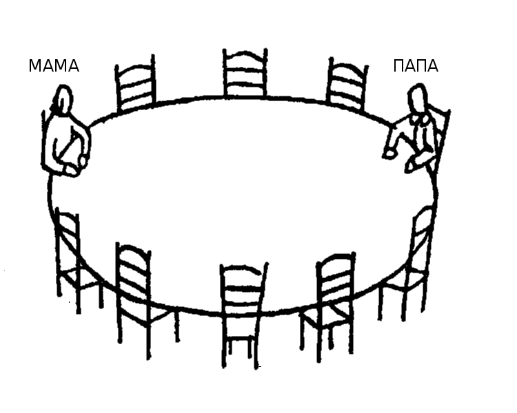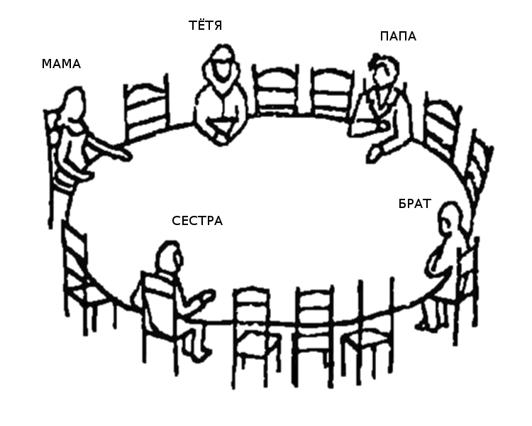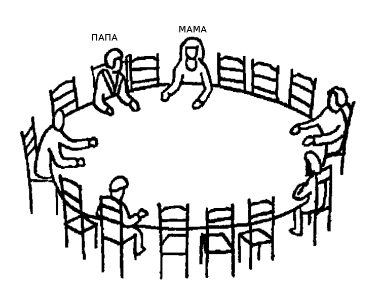 4. А тепер розмісти кілька людей і себе навколо цього столу. Познач їх родинні стосунки (тато, мама, брат, сестра) або (друг, товариш, однокласник).
