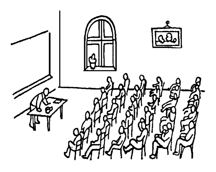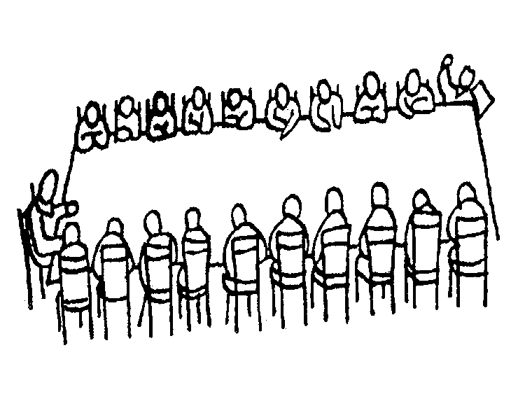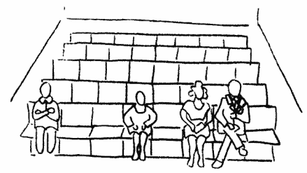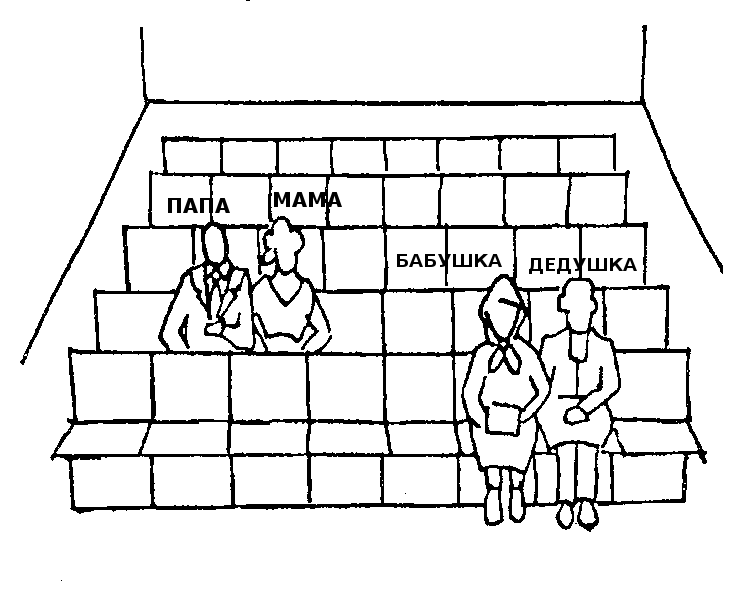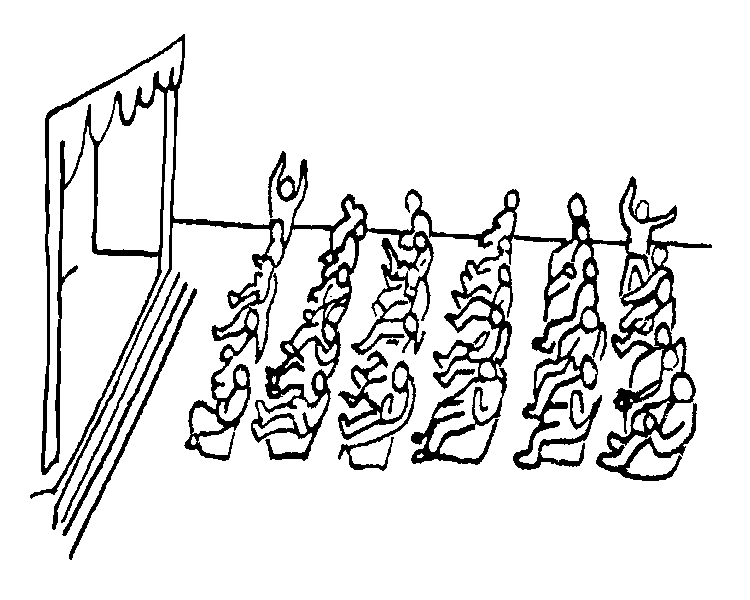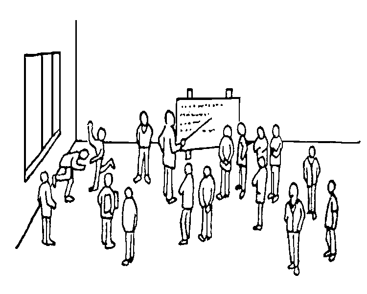 26. Ось людина, добре тобі відома. Вона щось говорить сидячим на стільцях людям. Ти знаходишся серед них. Познач хрестиком, де ти.