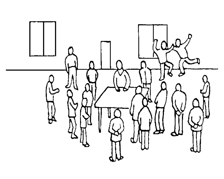 28. Ці люди стоять навколо столу, і один з них щось пояснює. Ти знаходишся серед тих, які слухають. Познач, де ти.