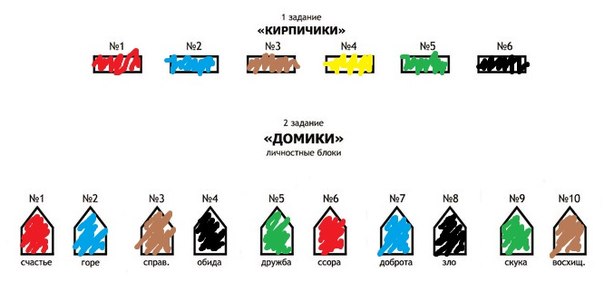 Завдання №2 і №3 по суті розшифровують емоційну сферу першокласника і орієнтують дослідника в ймовірних проблемах адаптації. Завдання №2 характеризує сферу соціальних емоцій. Тут треба оцінити ступінь диференціації емоцій – в нормі позитивні почуття дитина розфарбовує основними кольорами, негативні – коричневим і чорним. Слабка чи недостатня диференціація вказує на деформацію в тих чи інших блоках особистісних відносин: Щастя-горе – блок базового комфорту, Справедливість-образа – блок особистісного зростання, Дружба-сварка – блок міжособистісної взаємодії, Доброта-злість – блок потенційної агресії, Нудьга-захоплення – блок пізнання. При наявності інверсії колірної шкали(основні кольори займають останні місця) у дітей часто спостерігається недостатня диференціація соціальних емоцій – наприклад, і щастя і сварка можуть бути позначені одним і тим же червоним кольором. У цьому випадку треба звернути увагу, як розфарбовує дитина парні категорії і наскільки далеко стоять пари в колірному виборі. Актуальність переживання дитиною того чи іншого почуття вказує його місце в колірній шкалі (завдання №1). У завданні №3 відображено емоційне ставлення дитини до себе, шкільної діяльності, вчителя та однокласників. Зрозуміло, що при наявності проблем в якійсь сфері, першокласник розфарбовує саме ці будиночки коричневим або чорним кольором. Доцільно виділити ряди об’єктів, які дитина позначила однаковим кольором. Наприклад, школа-щастя-захоплення або домашні завдання-горе-нудьга. Ланцюжки асоціацій досить прозорі для розуміння емоційного ставлення дитини до школи. Діти зі слабкою диференціацією емоцій швидше за все будуть амбівалентні і в емоційній оцінці видів діяльності. За результатами завдання №3 можна виділити три групи дітей: