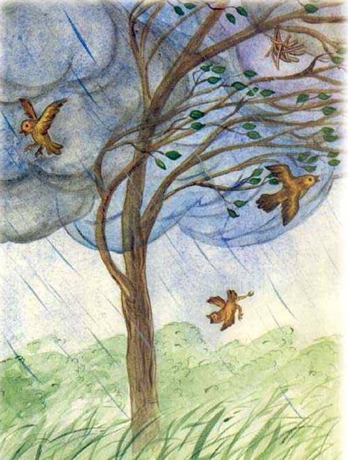 «У гніздечку на дереві сплять пташки: тато, мама і маленьке пташеня. Раптом налетів сильний вітер, гілка зламалася, і гніздечко падає вниз: всі опинилися на землі. Тато летить і сідає на одну гілку, мама сідає на іншу. Що робить пташеня?»