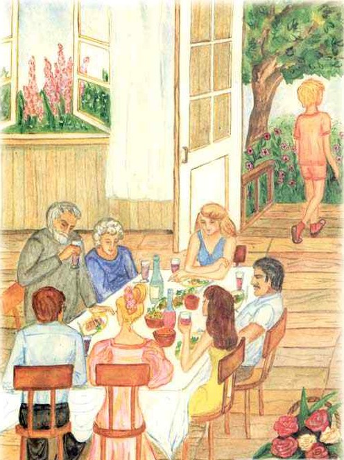 «Відзначається річниця весілля батьків. Мама і тато дуже люблять один одного і хочуть весело відзначити свято. Вони запросили всіх друзів і своїх батьків. Під час свята їх дитина встає, і одна іде в сад. Що сталося, чому вона пішла?»