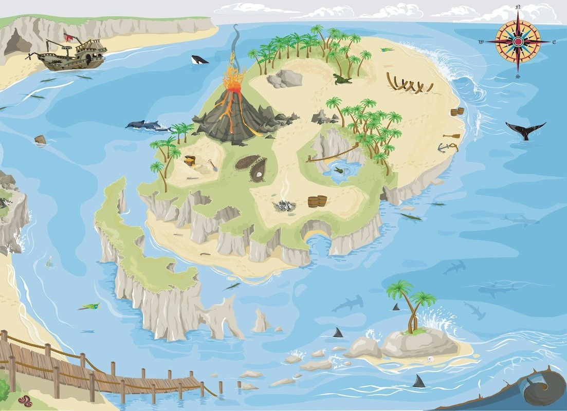 Потім ведучий пропонує дітям створити на острові такі умови, при яких можна було б вижити. Дітям необхідно придумати і намалювати: житло, їжу та способи її добування, воду, захист від нападу і т.д. Також дітям необхідно намалювати географічну карту острова: гори, пляжі, джерела води (можливо, корисних копалин – діти дуже люблять малювати поклади золота і алмазів), вулкани, ліси і т.д.