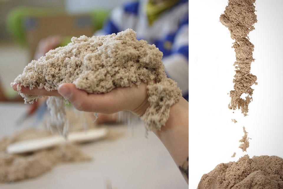 Сьогодні пропонуємо порадувати діток дуже приємним і незвичайним піском. Пісок цей називається кінетичним. Він дуже цікаво поводиться. Якщо його прим’яти – стає щільним, якщо натиснути на нього – розпадеться. Дивно те, що цей пісок ніколи не висихає. Він також зовсім не липне до рук. Фігурки, які виліплені з цього піску чудово зберігають свою форму. Одним словом, на вигляд це звичайний пісок, але властивості його зовсім інші. Дітям дуже подобається грати з ним, вони можуть годинами пересипати, ліпити, не відволікаючись.