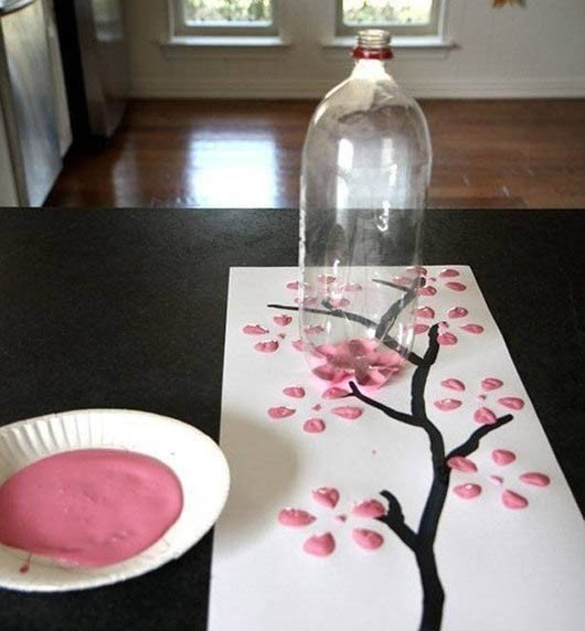 1. Намалювати дерево можна за допомогою пластикової пляшки, занурюючи її дно у фарбу і потім роблячи відбитки на аркуші.