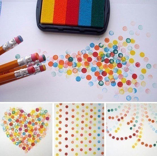 2. Якщо промокнути губку фарбою і занурити в неї гумку від олівця, то можна намалювати ідеально рівні кружечки. Це може бути точковий малюнок по заздалегідь створеному контуру або листочки дерева на намальованому звичайним пензликом стовбурі – все що підкаже фантазія вам і вашому маленькому художнику.