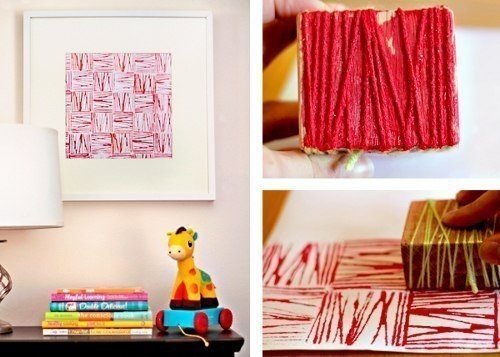 5. Цікаві картини виходять, якщо ставити відбитки клубком ниток або нитками, одягненими на брусок – все геніальне просто!