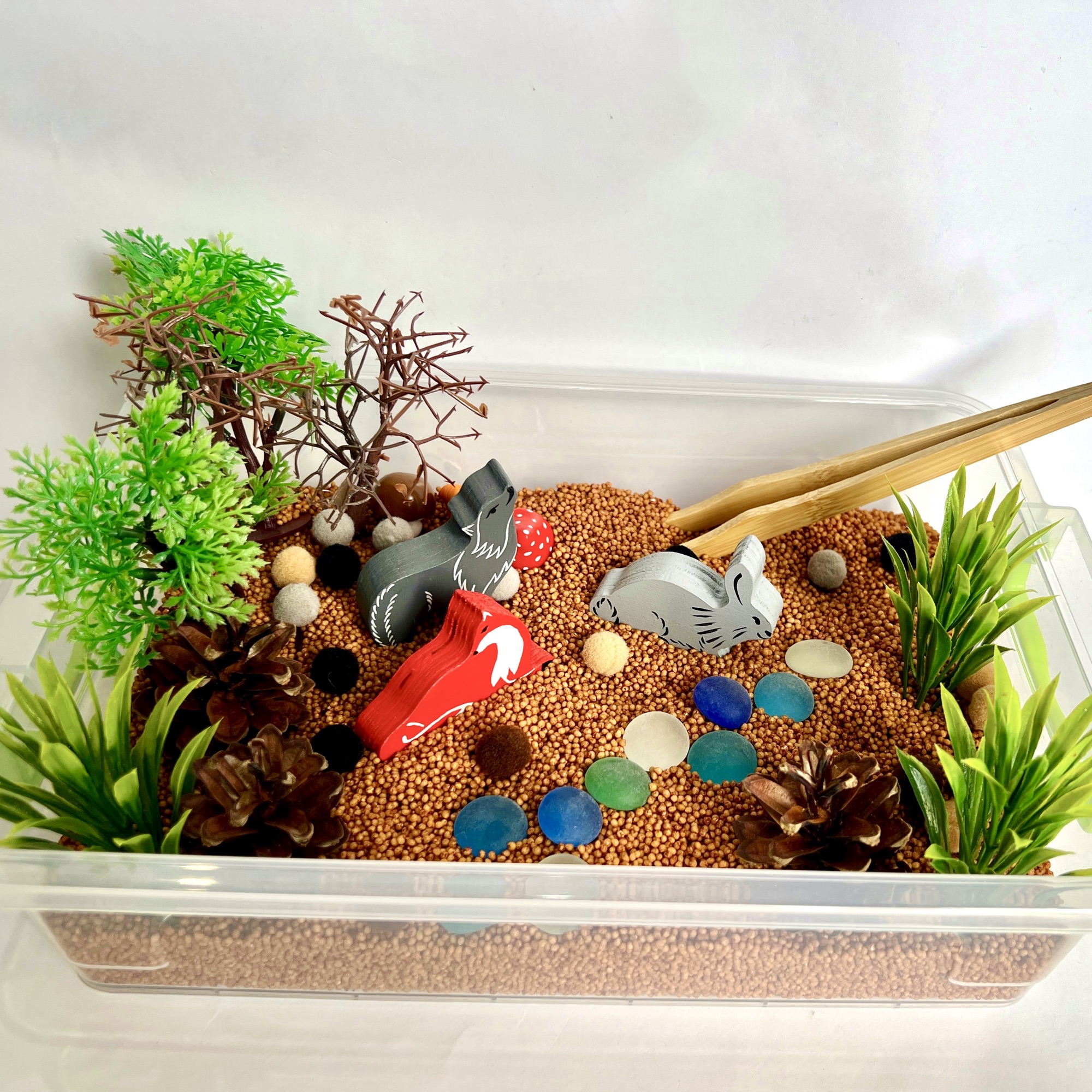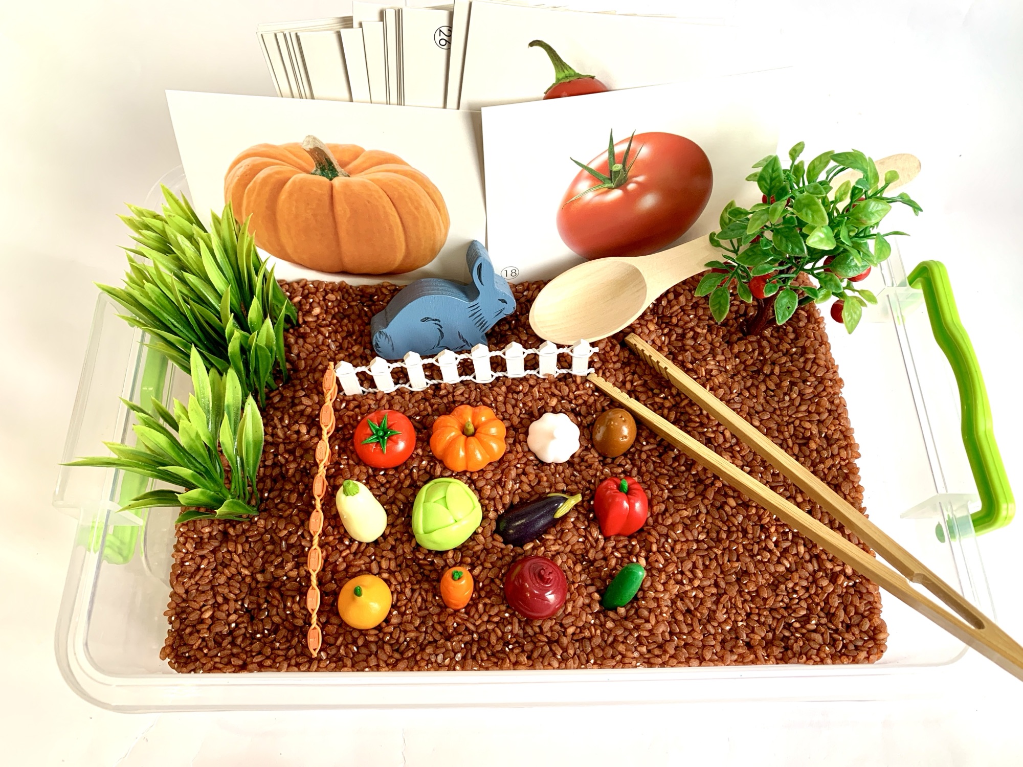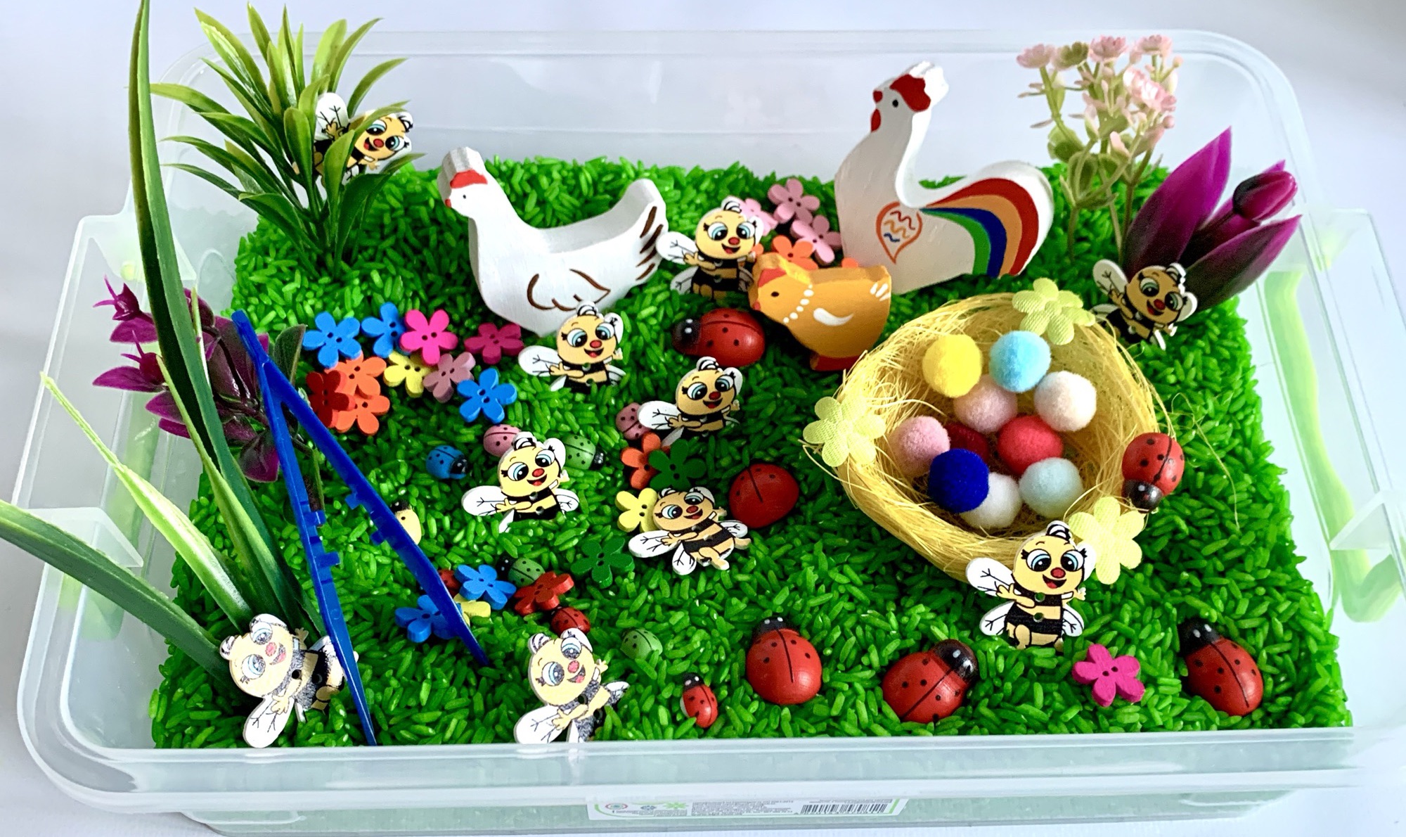 Можна створювати в коробці певну тематику. Наприклад, взяти тарілочки, ложки, фігурки домашніх тварин і нагодувати їх; насипати в коробку пісок, копати ямки і садити рослини; покласти в коробку дитячу посудку, насипати різних за розміром і формою круп, макаронів та інших сипучих і готувати суп.