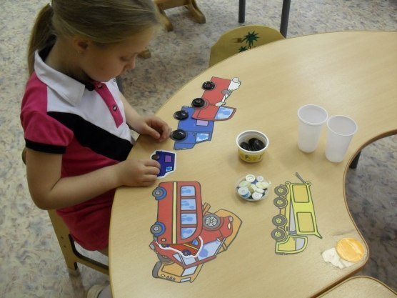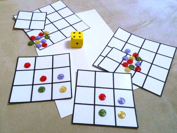 Ігровий матеріал: дві картки (розділені на 9 квадратів) і два набори ґудзиків (18 штук попарно однакових).