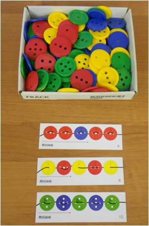 Хід гри: запропонувати дитині викладати гудзики в певній послідовності. Наприклад, велика – маленька, велика – маленька і т.д., або червона – синя, червона – синя і т.д., або червона – синя – зелена, червона – синя – зелена, або одна червона – дві жовті, одна червона – дві жовті і т.п., в залежності від того, які гудзики ви підготували для гри. Можна запропонувати викладати за схемою.