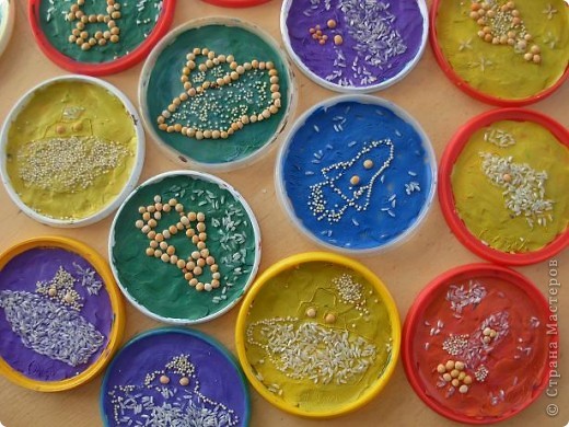 - Крупи можна використовувати для пластилінових картинок і фігурок. Вдавлювати крупинки в пластилін одне задоволення.