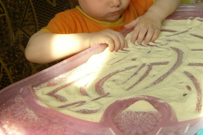 - Пальчиковий басейн – просто насипати крупу у велику миску, на столик або піднос і водити ручками, пересипати, набираючи в кулачки – це дозволить малюкові познайомитися з крупою. Можна малювати пальчиками доріжки, сонечко, інші малюнки.