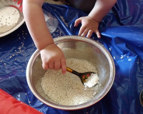 - Крупу можна пересипати з однієї ємності в іншу. Пробуйте працювати ручками, пальчиками, совочком, ложкою, мірними стаканчиками. Десь з 1,5 років, а може й раніше, ваш малюк навчитися ложкою засипати крупу в баночку.