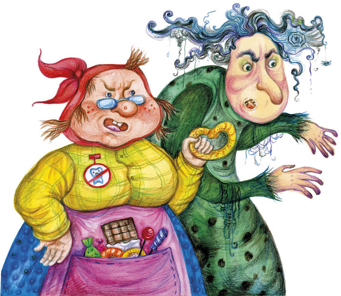 Щоб не сталося такого лиха і всі зубки залишилися на місці, треба для початку позбутися онучок, Вреднюшки і Ласунки, почати чистити зубки 2 рази на день, вранці і ввечері, і перестати їсти багато солодкого.