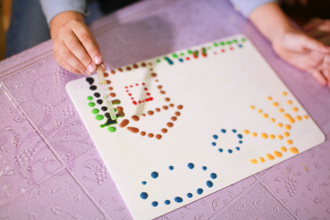 Основний принцип роботи полягає в наступному: дитина набирає піпеткою кольорову воду і «малює» крапельками на пластиковій дошці або папері.