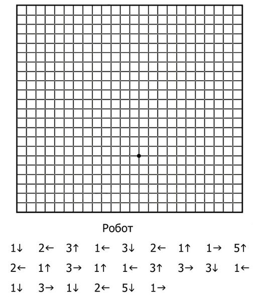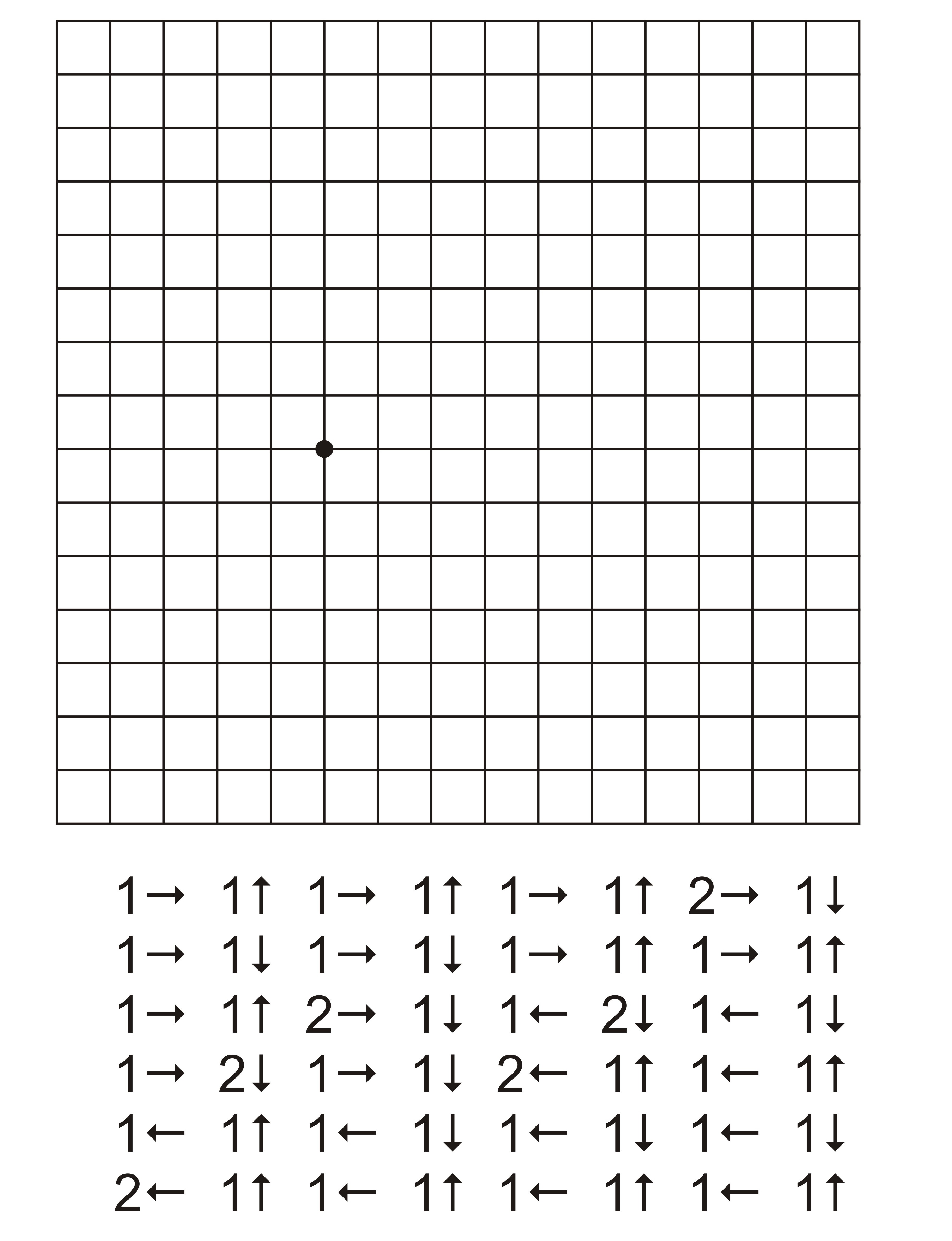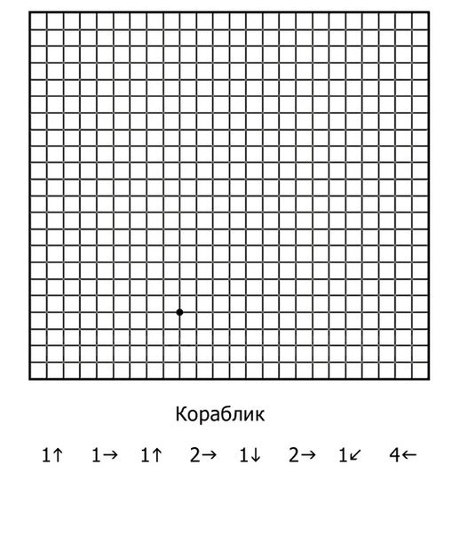 Приклад диктування графічного диктанту: 1 клітинка вправо, 3 клітинки вгору, 2 клітинки вліво, 4 клітинки вниз, 1 клітинка вправо.