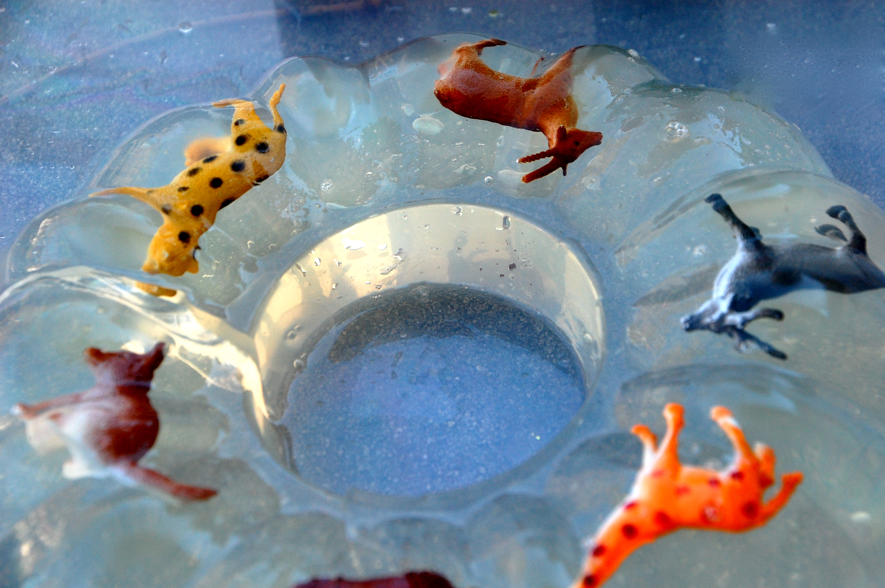 Абсолютно безпрограшний варіант гри – влаштувати рятувальну операцію і допомогти тваринам вибратися з крижаного полону. Спершу, зрозуміло, їх потрібно заморозити з водою. Маленькі фігурки в формі для льоду. Великі фігурки покласти в пластиковий лоток. Наступного дня з морозильної камери ви дістанете заледеніле чудо, яке займе дитину мінімум на годину-півтори. Дайте їй миску або тацю, ложки-лопатки, молоточок – те, що зручно і безпечно буде довбати лід. Налийте в окрему склянку теплої води, щоб лід можна було швидше розтоплювати. Розкажіть, що звірам потрібна допомога – вони застрягли у кризі і дуже хочуть назовні. Коли тварини за допомогою дитини виберуться, запропонуйте їй витерти їх ганчіркою, вкрити покривалом щоб ті зігрілися, а в разі переохолодження – вилікувати.