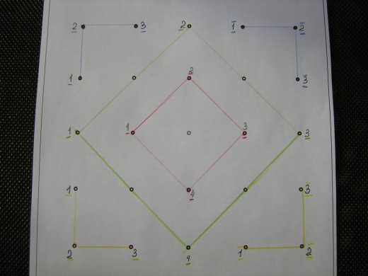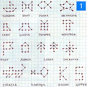 3. Малювання малюнків за схемою. Заготуйте дидактичні картки з нанесеними на них крапочками так, як це зроблено на полі геоборда.