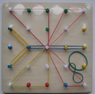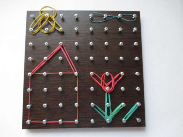 Одягаючи гумку на два штирі, можна отримати пряму лінію, на три – трикутник, на чотири – квадрат. З ліній і фігур можна створювати різні зображення, що просто неможливо не використовувати в іграх і навчанні дітей.