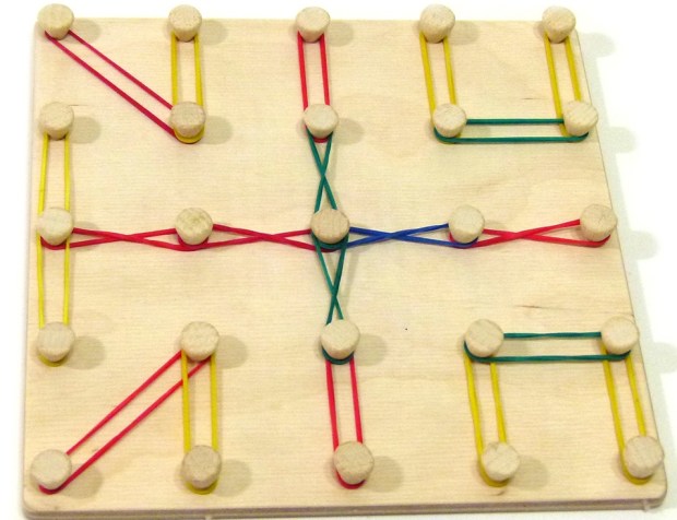 Одягаючи гумку на два штирі, можна отримати пряму лінію, на три – трикутник, на чотири – квадрат. З ліній і фігур можна створювати різні зображення, що просто неможливо не використовувати в іграх і навчанні дітей.