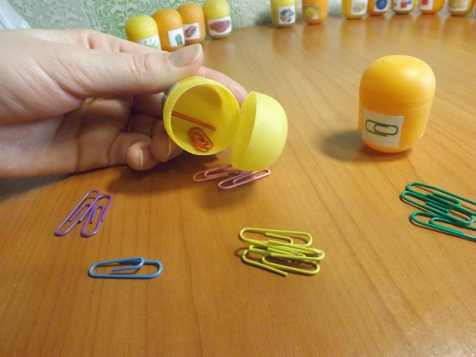 Пластикові контейнери для іграшки від шоколадних яєць можна використовувати для різноманітних розвиваючих ігор.