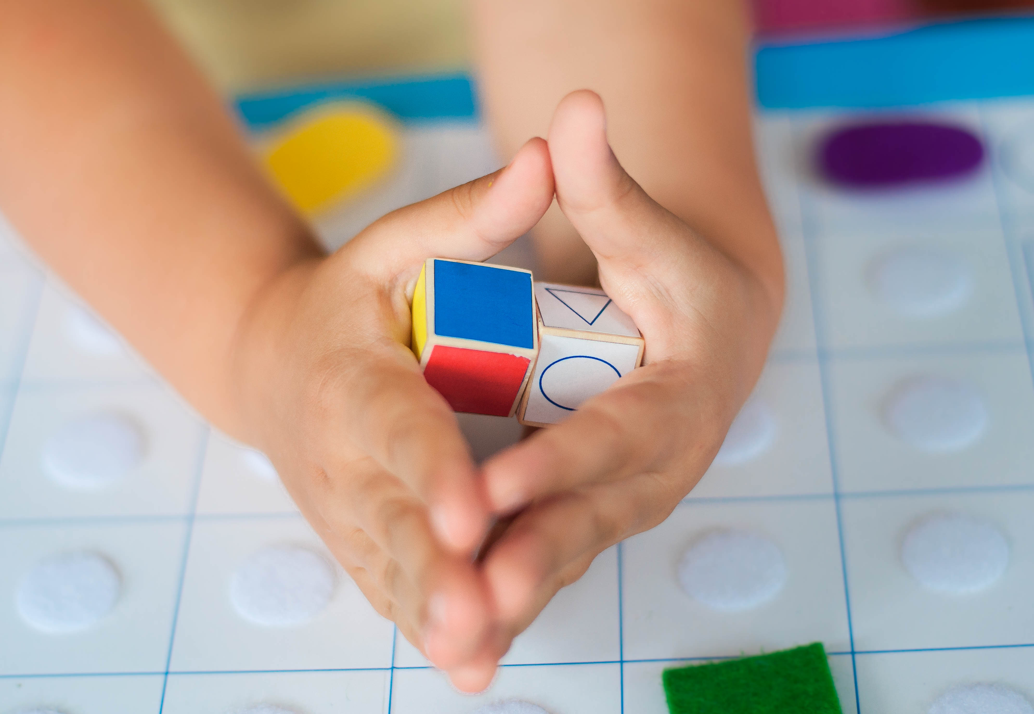 2 кубика, на яких зображені кольори та геометричні фігури. Розмір кубик 2 см × 2 см × 2 см
