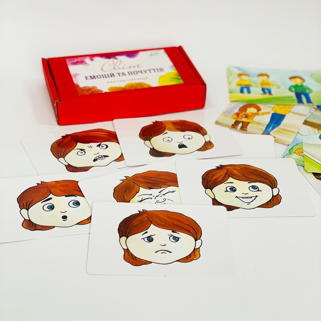 📍В наборі є одна картка, на якій нічого не зображено, вона повністю біла. За бажанням, дитина або психолог можуть домалювати фломастером на ній емоцію, почуття чи ситуацію, яких немає в наборі. Потім її легко можно стерти вологою серветкою.