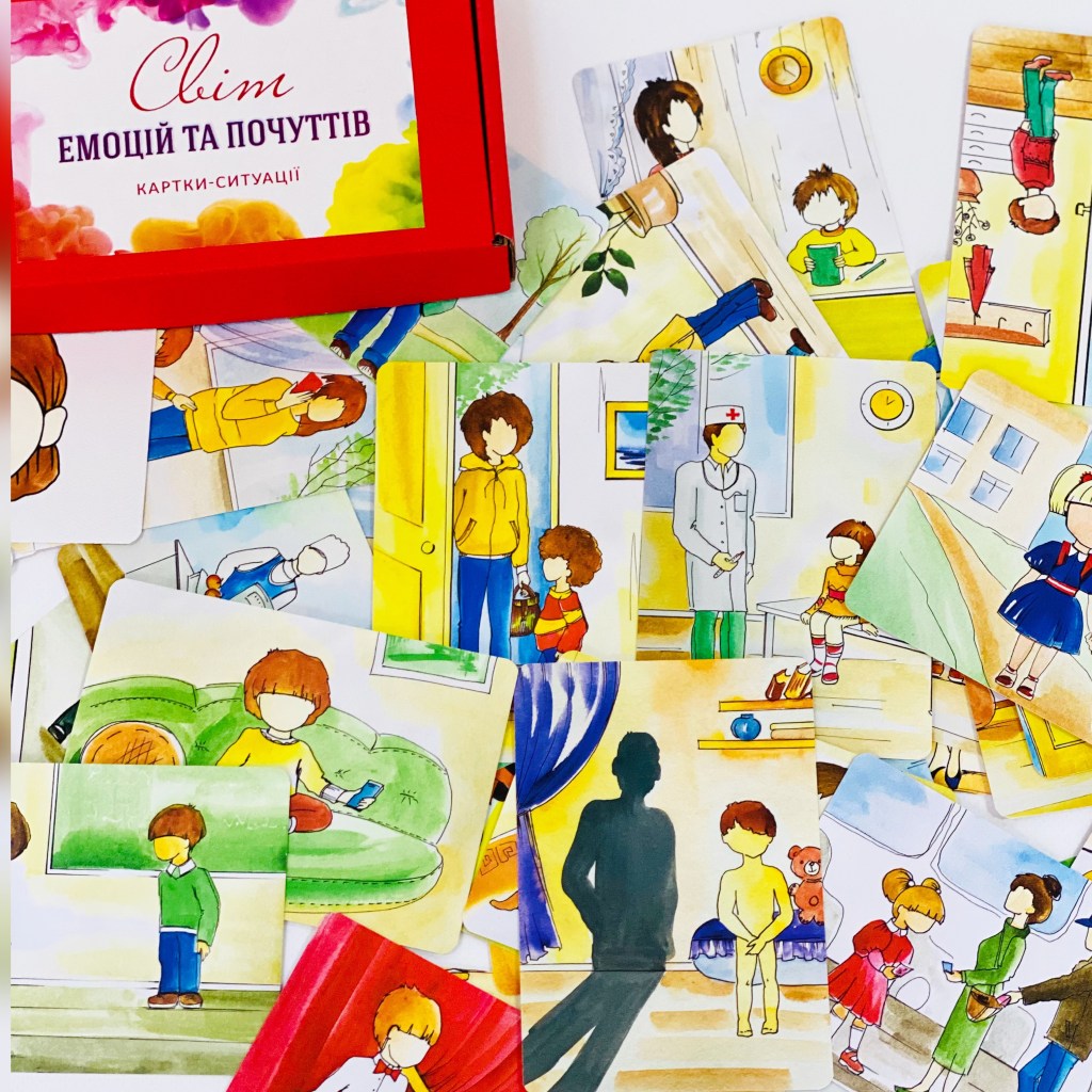 «Світ емоцій та почуттів. Картки-ситуації». Особливість її в тому, що герої зображені на малюнках без облич. Ідея в тому, що кожна дитина сприймає ситуацію через призму своїх почуттів і присвоює героям ті емоційні стани, які вважає за потрібне.